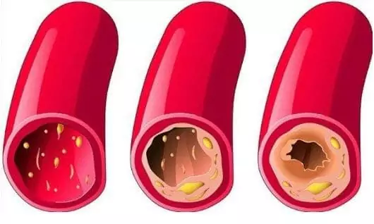 - Atherosclerosis.Mishipa ya damu haifanyi kazi tena vizuri: mishipa ndogo ya damu imefungwa kabisa na mishipa kuu ya damu ina cholesterol ya juu.